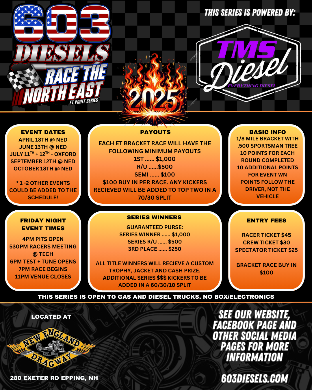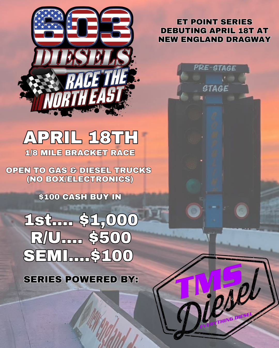 Welcome to 603 Diesels Race The North East ET Points Series. We are excited to bring you a racing program for the 2025 Season that is open to both Gas and Diesel Trucks.
