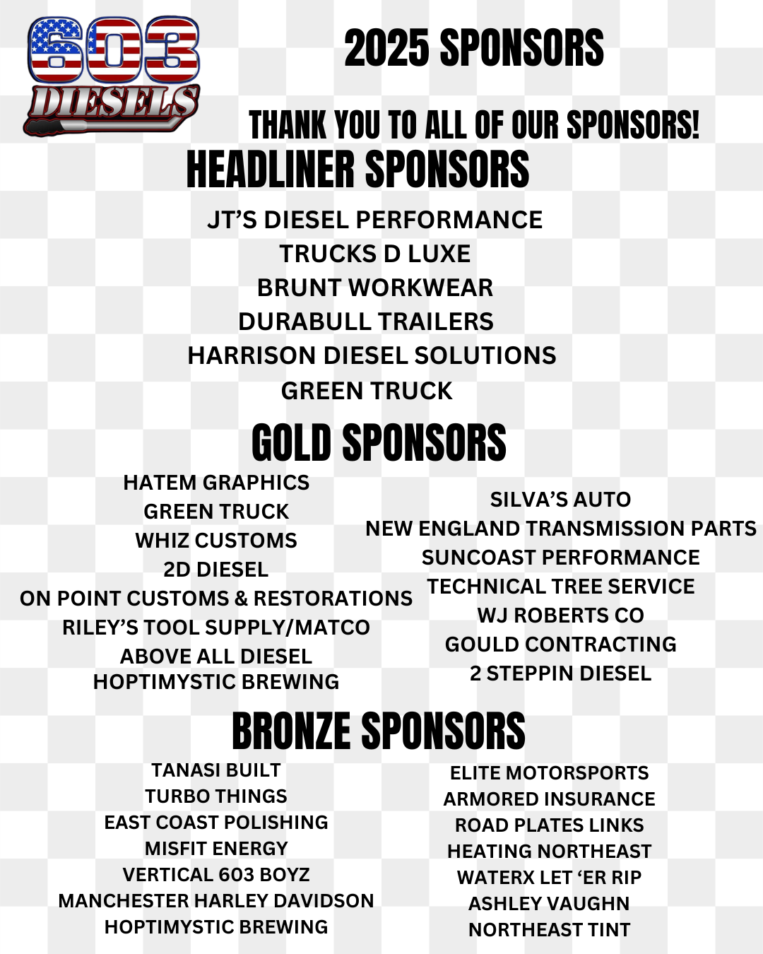 603 Diesels is incredibly grateful for all of our sponsors. When looking for a business to support please consider those who support us and the industry! Below you will find direct links to our sponsors!
