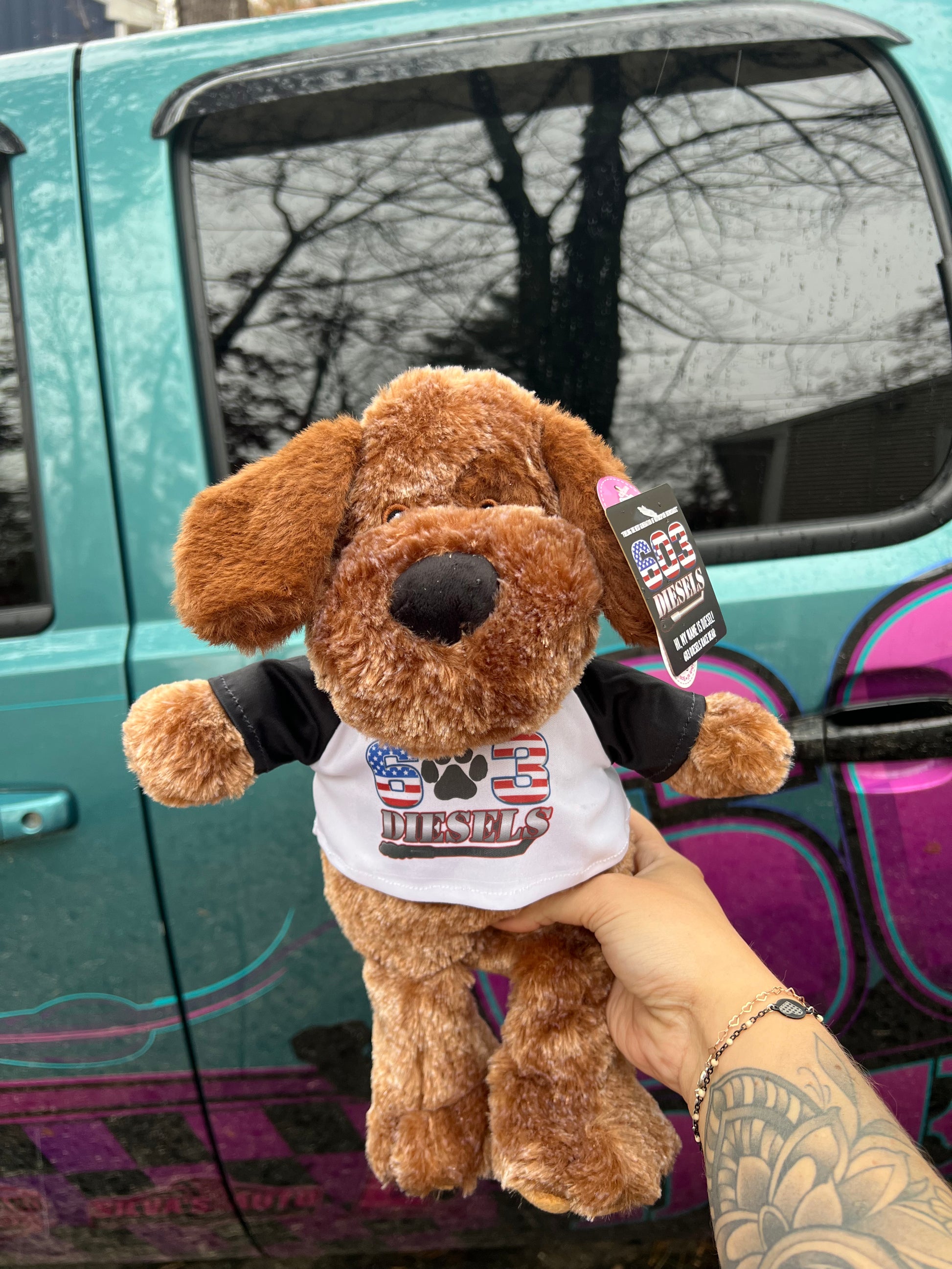 Meet Diesel our checkered Race Doggo! He is 9” tall and loves sitting passenger in trucks or at the races!